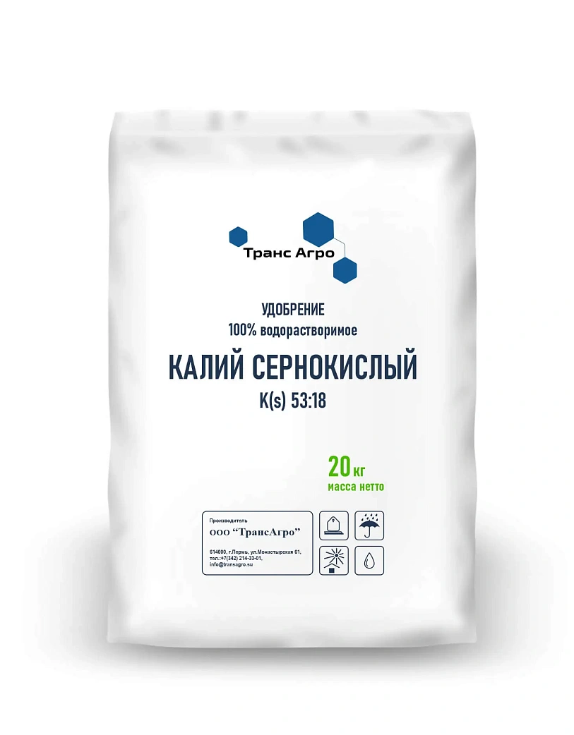 Представляет собой перекристаллизованный сульфат калия, отфильтрованный от нерастворимых в воде примесей и излишних хлоридов. Сульфат калия предназначен для питания культур открытого и закрытого грунта с внесением напрямую в почву либо через любые системы орошения.